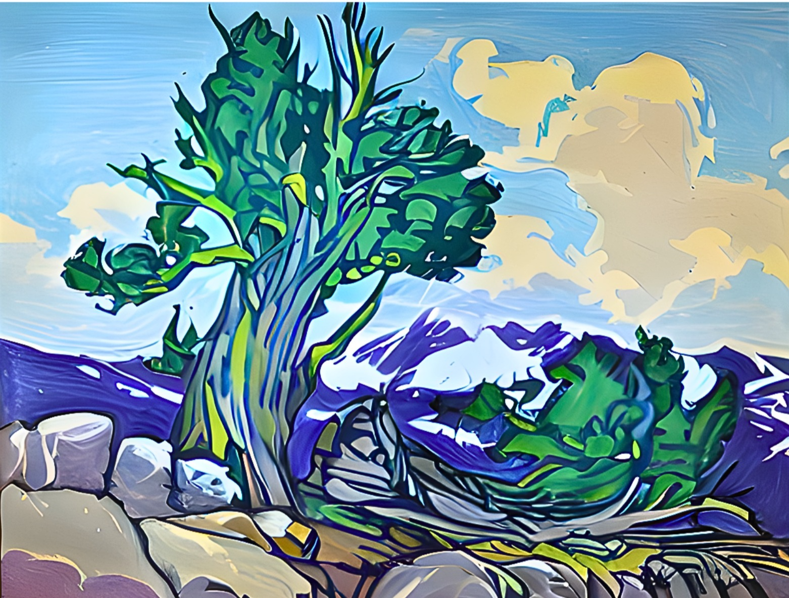 Bristlecone pines are ancient trees, sometimes living to be thousands of years old. They grow in small groves at high altitudes, often in windswept locations.